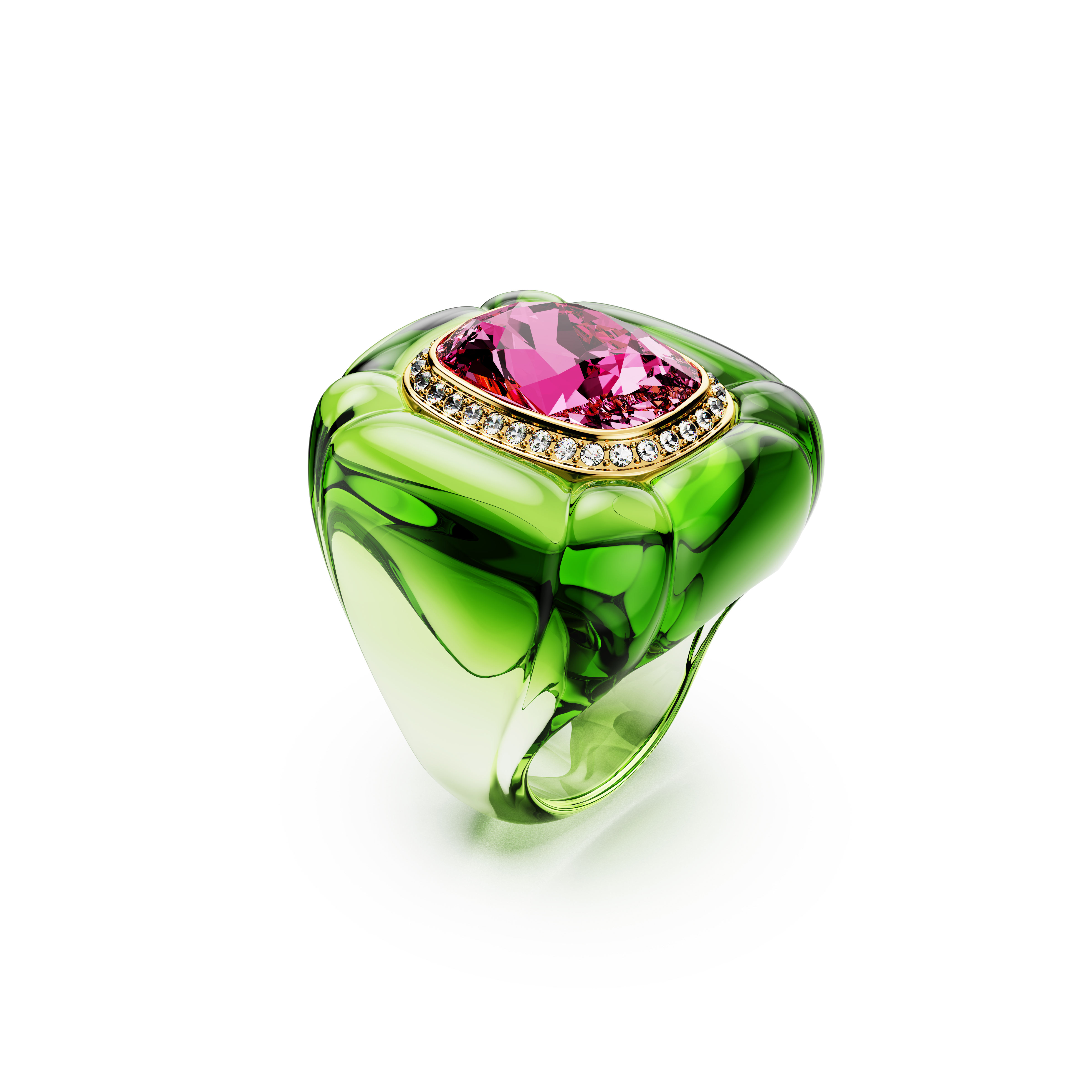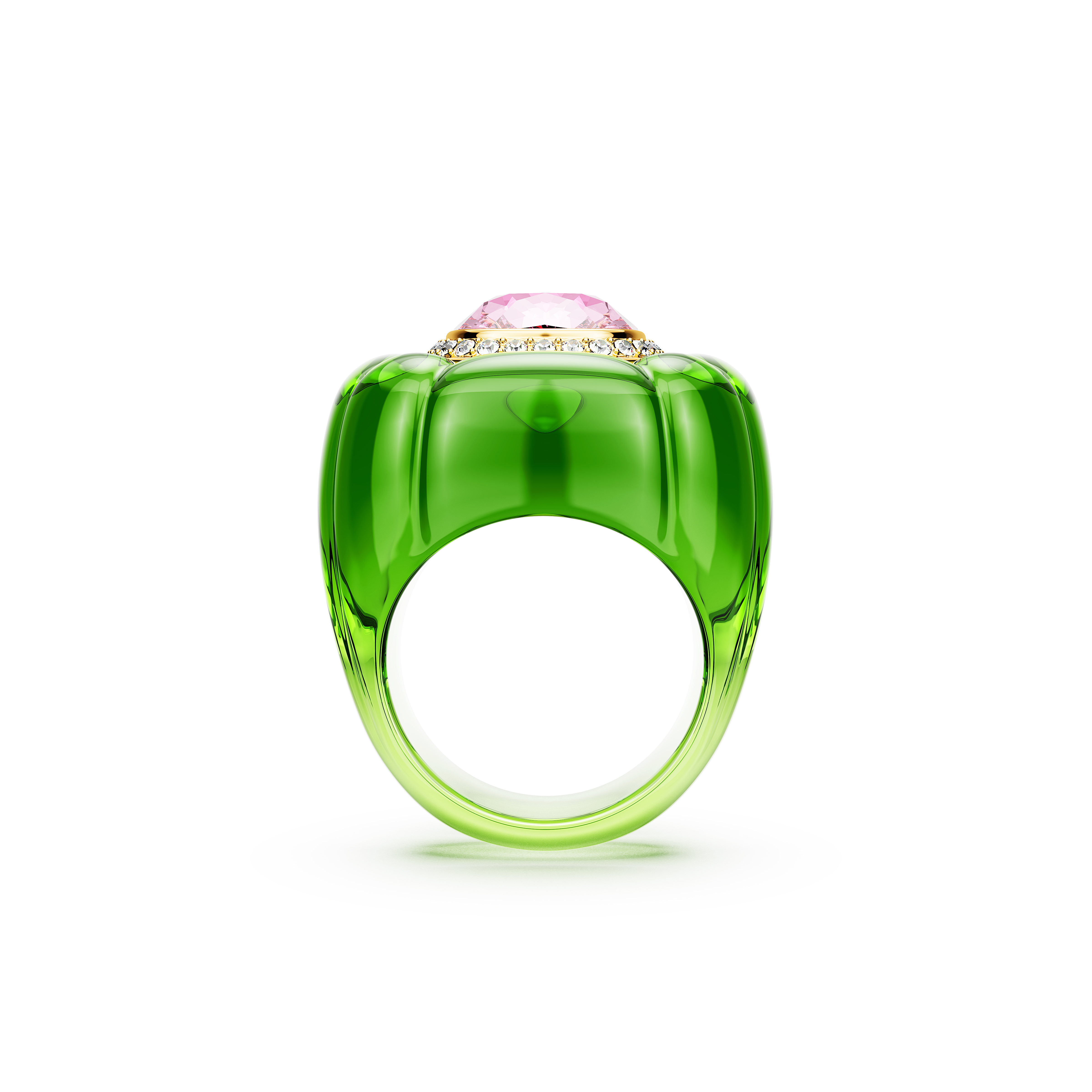 Pop Art akımının neşesinden ilham alan bu kokteyl yüzüğü, tarzınıza renk katmanın oyuncu bir yoludur. Yeşil bant, altın rengi kaplama bir çerçeve içinde beyaz pavé ile çevrili pembe yastık kesim bir kristalle tamamlandı. Çarpıcı ve parlak bir dokunuş için istediğiniz zaman takın veya yaratıcılığınızı ifade etmek için Dulcis ailesinin diğer kokteyl yüzükleriyle birlikte kullanın.